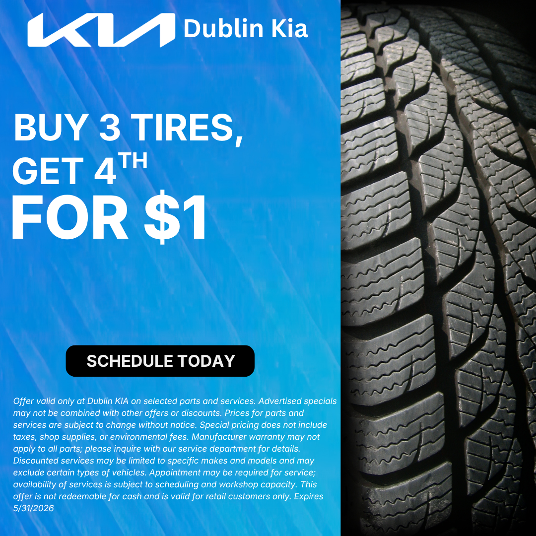 Offer valid only at Dublin KIA on selected parts and services. Advertised specials may not be combined with other offers or discounts. Prices for parts and services are subject to change without notice. Special pricing does not include taxes, shop supplies, or environmental fees. Manufacturer warranty may not apply to all parts; please inquire with our service department for details. Discounted services may be limited to specific makes and models and may exclude certain types of vehicles. Appointment may be required for service; availability of services is subject to scheduling and workshop capacity. This offer is not redeemable for cash and is valid for retail customers only. Expires 5/31/2026
