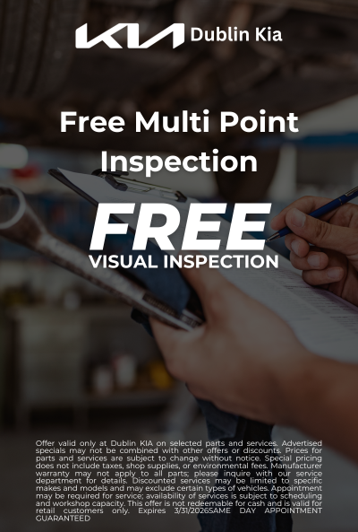 Offer valid only at Dublin KIA on selected parts and services. Advertised specials may not be combined with other offers or discounts. Prices for parts and services are subject to change without notice. Special pricing does not include taxes, shop supplies, or environmental fees. Manufacturer warranty may not apply to all parts; please inquire with our service department for details. Discounted services may be limited to specific makes and models and may exclude certain types of vehicles. Appointment may be required for service; availability of services is subject to scheduling and workshop capacity. This offer is not redeemable for cash and is valid for retail customers only. Expires 3/31/2026SAME DAY APPOINTMENT GUARANTEED