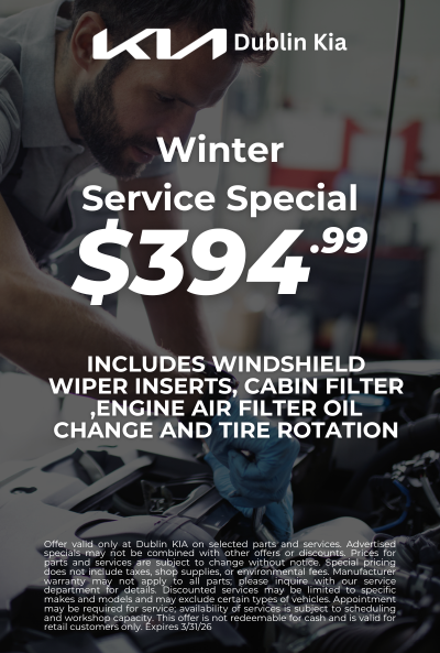Offer valid only at Dublin KIA on selected parts and services. Advertised specials may not be combined with other offers or discounts. Prices for parts and services are subject to change without notice. Special pricing does not include taxes, shop supplies, or environmental fees. Manufacturer warranty may not apply to all parts; please inquire with our service department for details. Discounted services may be limited to specific makes and models and may exclude certain types of vehicles. Appointment may be required for service; availability of services is subject to scheduling and workshop capacity. This offer is not redeemable for cash and is valid for retail customers only. Expires 3/31/26